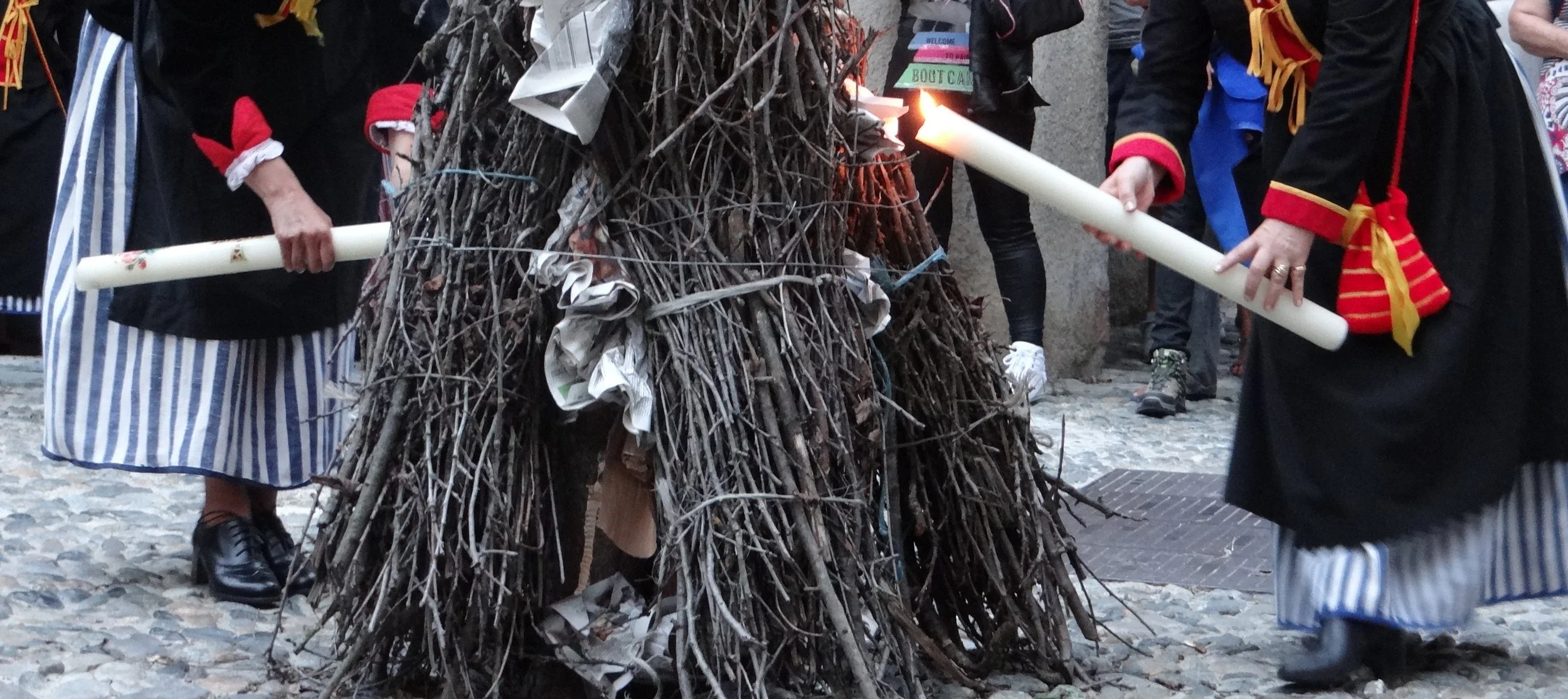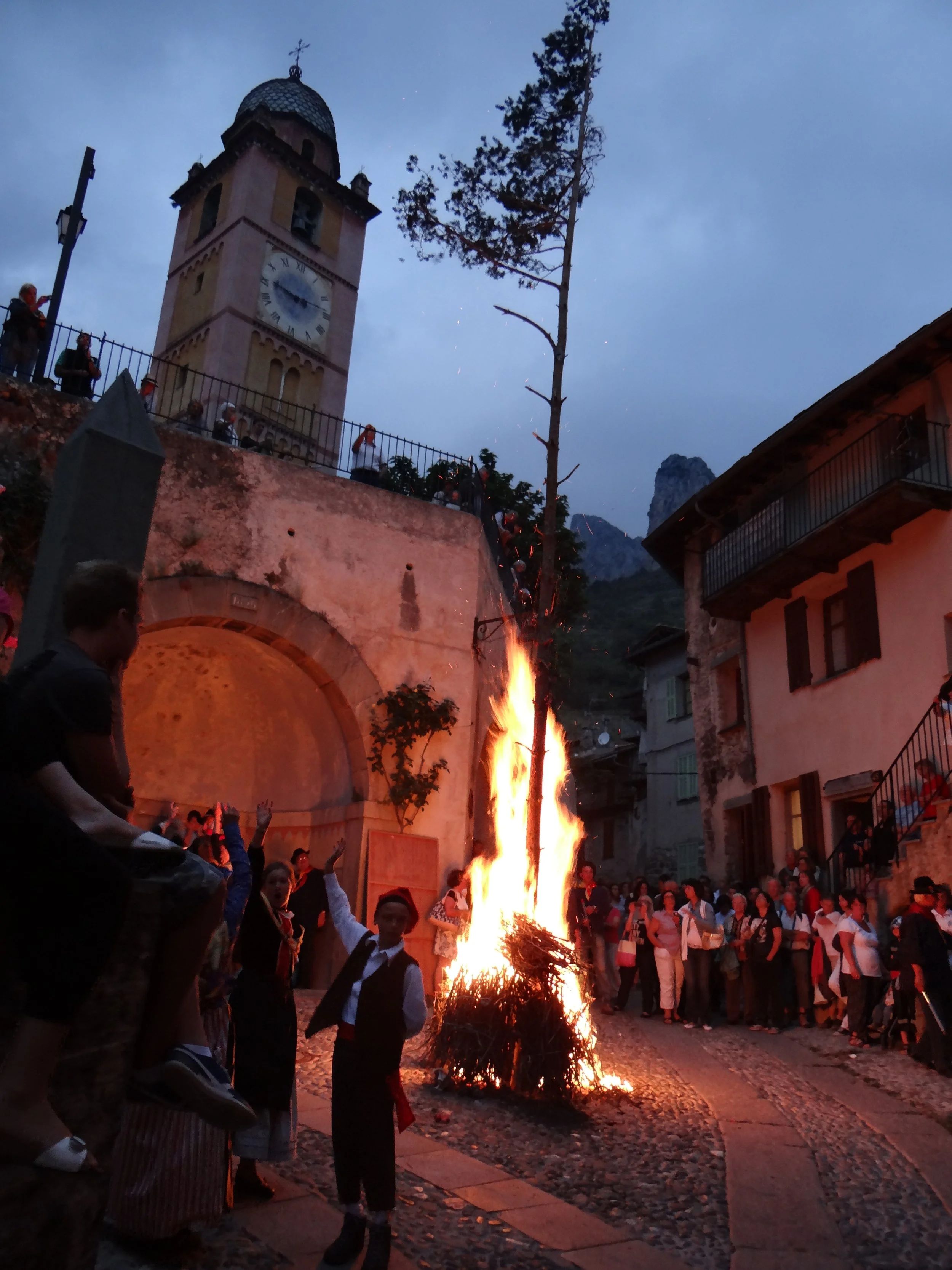 Les Prieuresses, à l’aide des grands cierges de St Eloi embrasent les “fascine” (fagots de bois séchés).